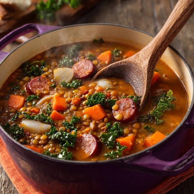 Herzhafter Linseneintopf mit bissfesten Linsen, Grünkohl, Süßkartoffel und Paprikawurst – ideal für kalte Tage!