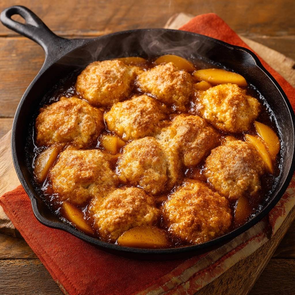 Stell dir vor, du beißt in diesen Apfel-Cobbler aus der Gusseisenpfanne. Der erste Löffel: Saftige Apfelspalten, die in warmer Karamellsoße baden, oben drauf knusprige Biscuits, die perfekt aufgehen und eine zuckrige Kruste haben. Der Duft von Zimt und Vanille zieht durch die Küche, als wärst du mitten im US-Süden.