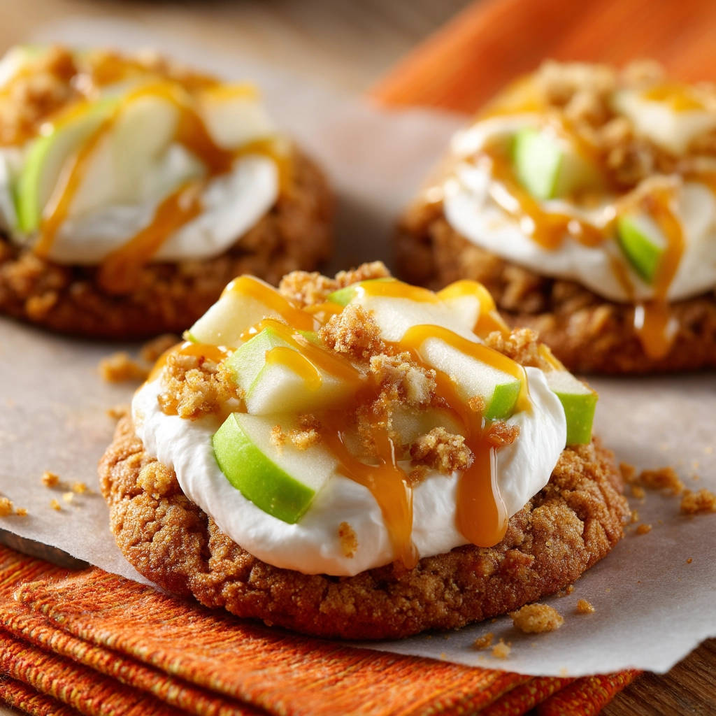 - Belegen der Cookies: Sobald die vorgebackenen Cookies leicht abgekühlt sind (ca. 5-10 Minuten auf dem Blech), verteilen Sie eine kleine Menge des Frischkäse-Toppings auf der Oberfläche jedes Kekses. Lassen Sie nun die Apfelwürfel kurz auf einem Sieb abtropfen, um überschüssigen Zitronensaft zu entfernen, und verteilen Sie sie dann auf dem Frischkäse-Topping. Zum Schluss die vorbereiteten Streusel großzügig darüber streuen.