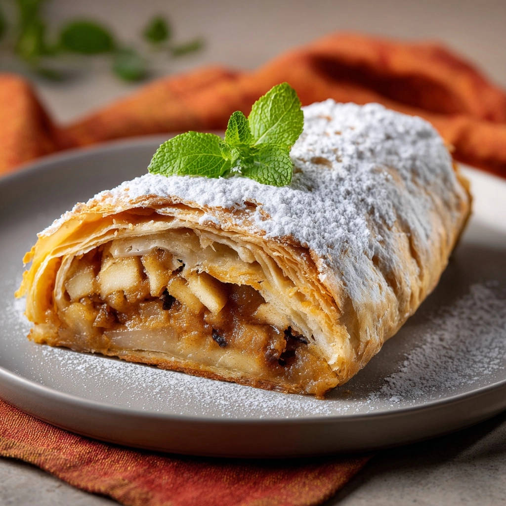 - Servieren: Den Apfelstrudel aus dem Ofen nehmen und auf einem Kuchengitter etwas abkühlen lassen. Vor dem Servieren großzügig mit Puderzucker bestreuen und mit frischer Minze garnieren. Genießen Sie jeden knusprigen Bissen!