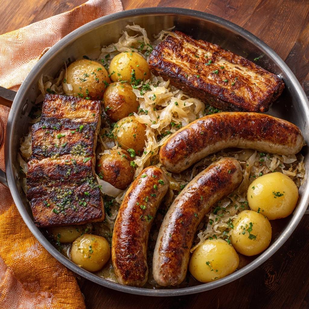 Stell dir vor, du öffnest den Deckel der Pfanne und ein Schwall von brutzelndem Goldbraun steigt auf. Knusprige Kartoffelstücke, saftige Würstchen, das frische Säuerliche vom Sauerkraut und der rauchige Biss vom Speck. Der erste Bissen knirscht so schön, dass du fast die Gabel fallen lässt.
