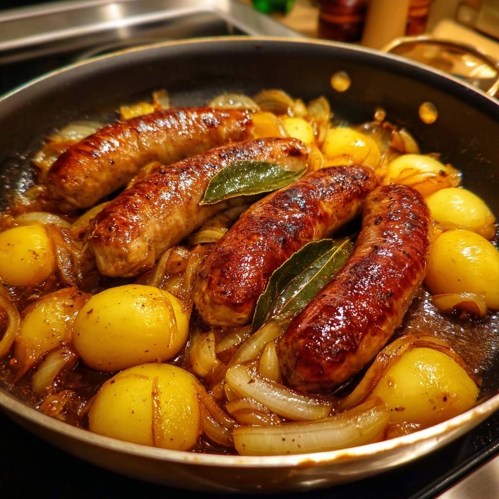 Stell dir vor, du öffnest den Deckel der Pfanne und dieser Duft steigt auf: goldbraune Bratwürste, knusprige Kartoffeln und süßliche Zwiebeln. Der erste Bissen? Die Kartoffeln bieten perfekten Widerstand, außen glasig glänzend, innen saftig. Kein Matsch, nur pure Freude.