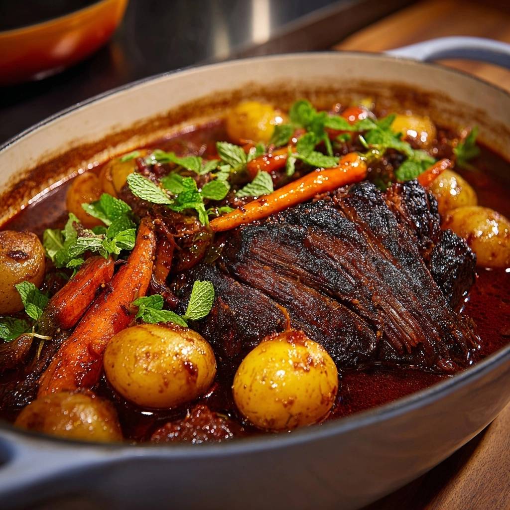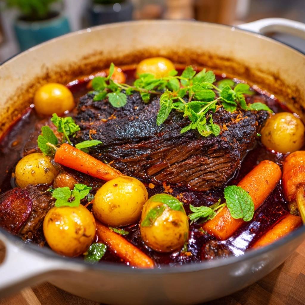 Stell dir vor, du hebst den Deckel vom Dutch Oven, und ein warmer Duft von gebratenem Fleisch, süßen Karotten und erdigen Kartoffeln strömt dir entgegen. Dein Rindfleisch zerfällt schon beim ersten Anstupsen mit der Gabel, so butterzart und saftig. Jeder Bissen schmilzt im Mund, die Soße umhüllt alles dick und rot, mit einem Hauch von Knoblauch und Paprika.