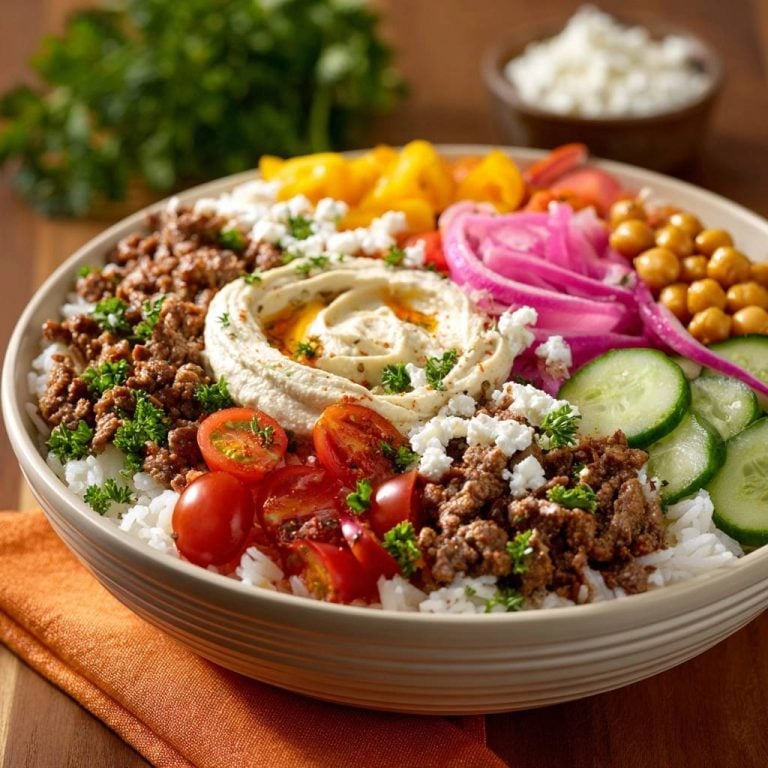 Frische Bowl mit saftigem Hackfleisch, cremigem Hummus, knackigem Gemüse und Feta auf Reis-Basis. Garantiert nicht trocken!