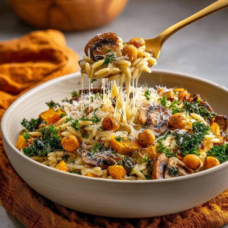 Cremiges Herbst-Pastagericht mit knusprigen Kichererbsen, Butternutkürbis, Pilzen und Grünkohl – goldknuspriger Crunch garantiert!