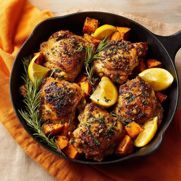 One-Pan-Gericht aus der Gusseisenpfanne: goldknusprige Haut und saftiges Hähnchenfleisch mit Süßkartoffeln, Zitrone und Rosmarin – nie wieder trockenes Fleisch!