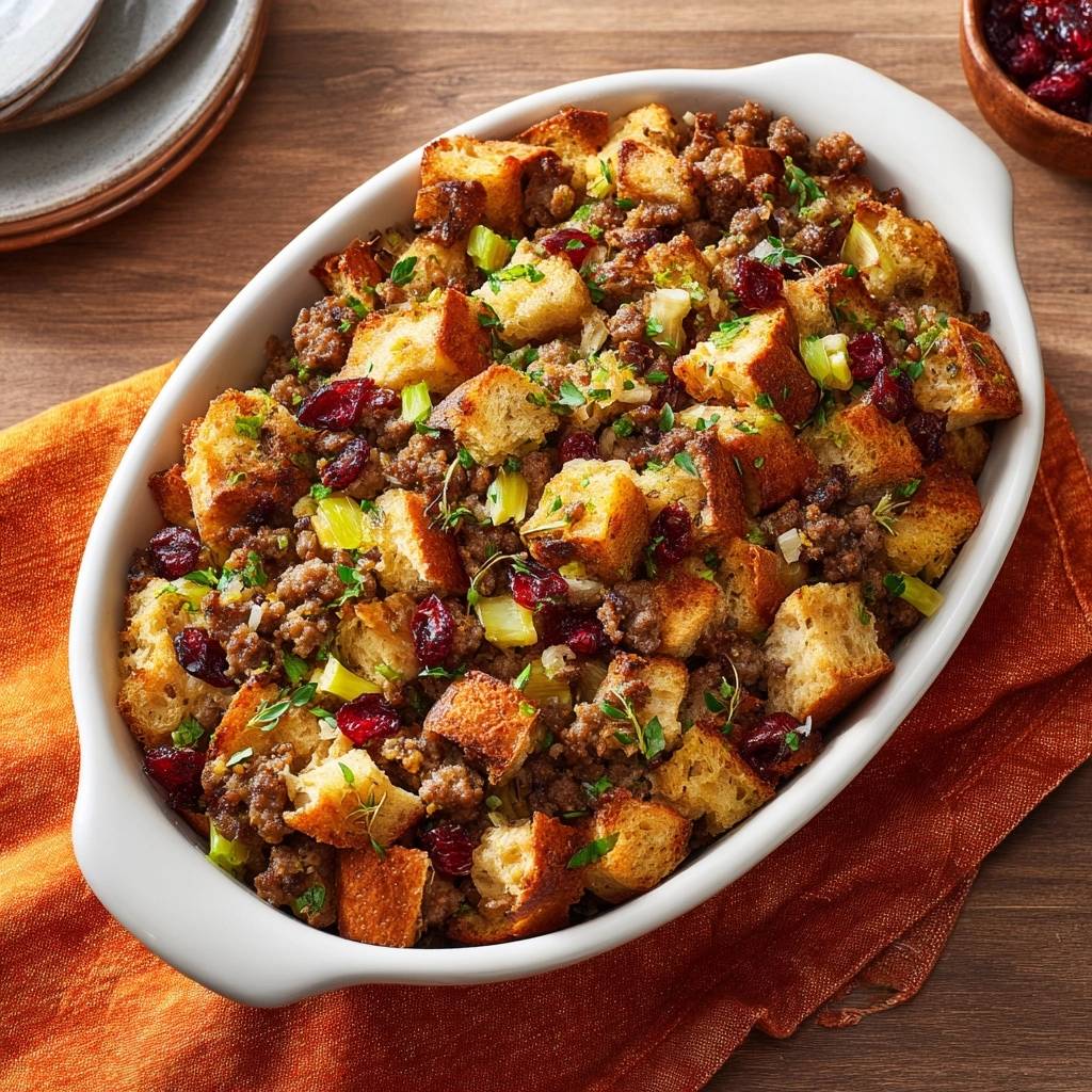 Stell dir vor, du schneidest in deine Festtagsfüllung, und statt matschigem Brei knackst es knusprig. Der Duft von gebratenem Geflügelwurstbrät mischt sich mit der fruchtigen Säure der Cranberries, Thymian streift würzig durch die Luft. Der erste Bissen explodiert: außen goldbraun kross, innen saftig und aromatisch.