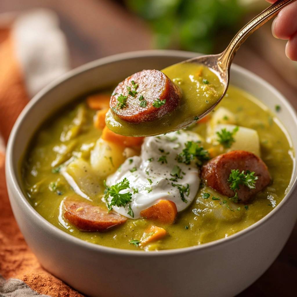 Cremige Erbsensuppe mit Wurst und Kartoffeln