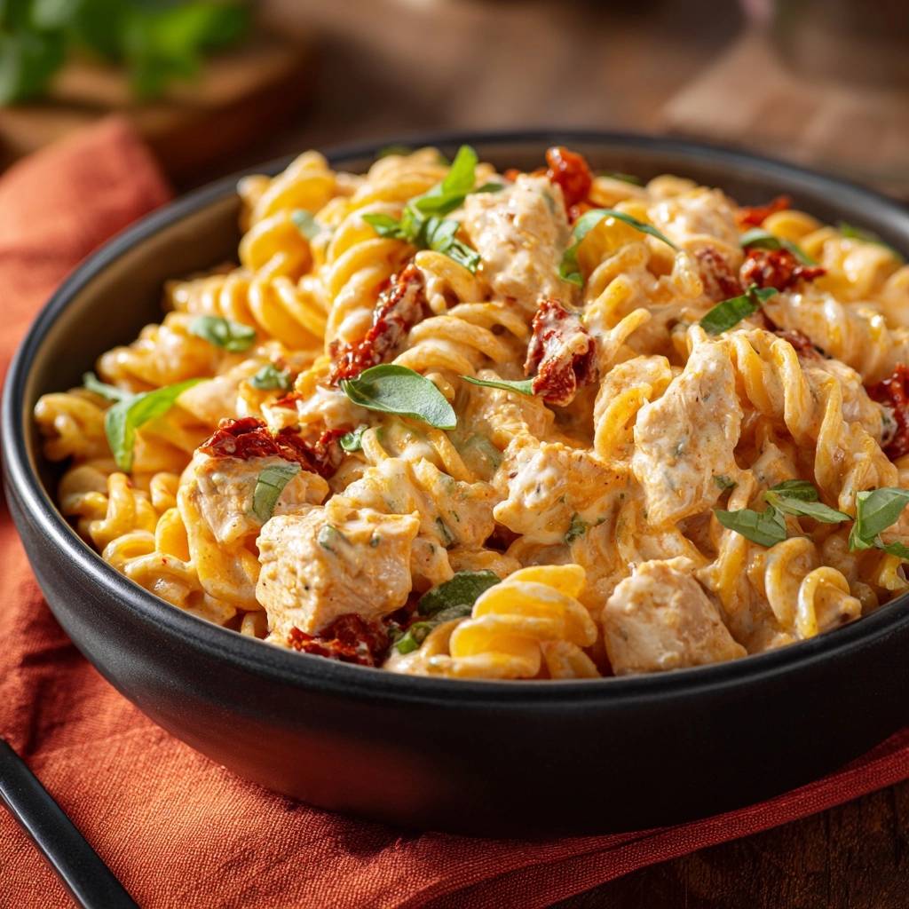 Cremige Fusilli mit Hähnchen und getrockneten Tomaten
