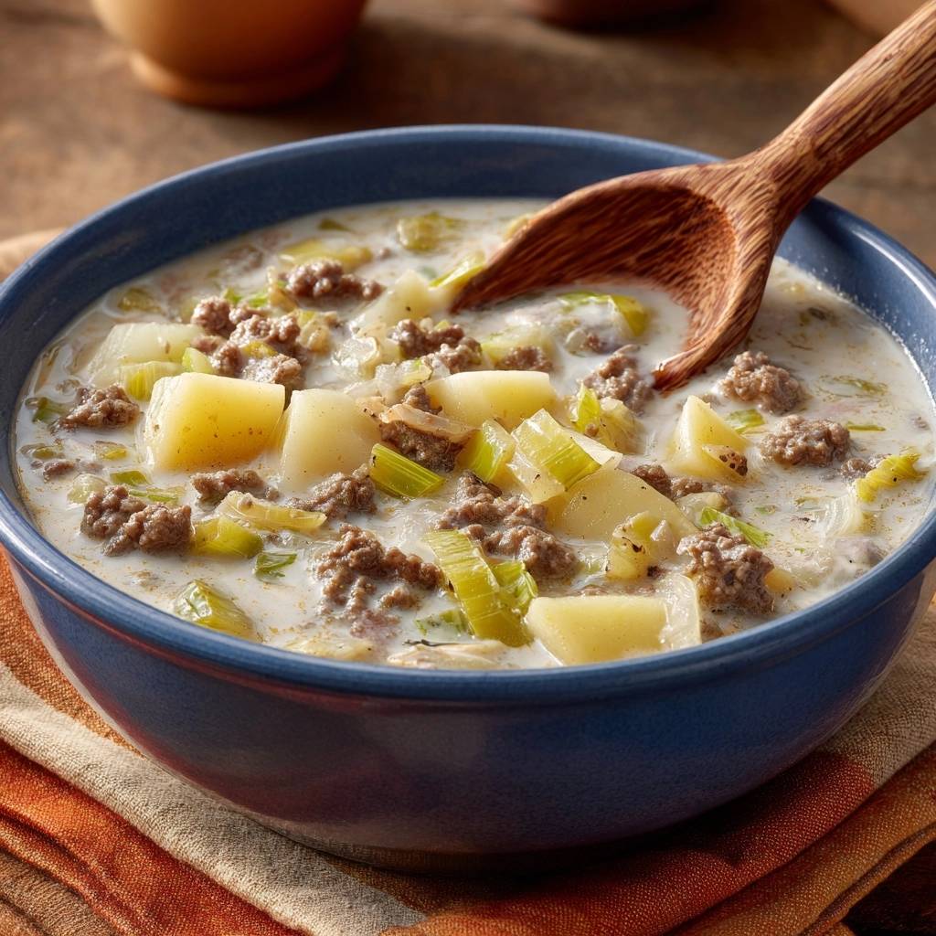 Cremige Kartoffel-Lauch-Suppe mit Hackfleisch