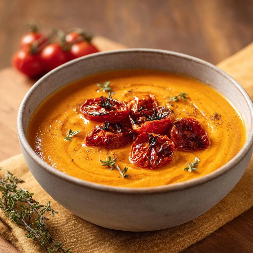 - Suppe heiß in Schalen füllen, mit gerösteten Tomaten und Thymian toppen. Sofort genießen – perfekt cremig!