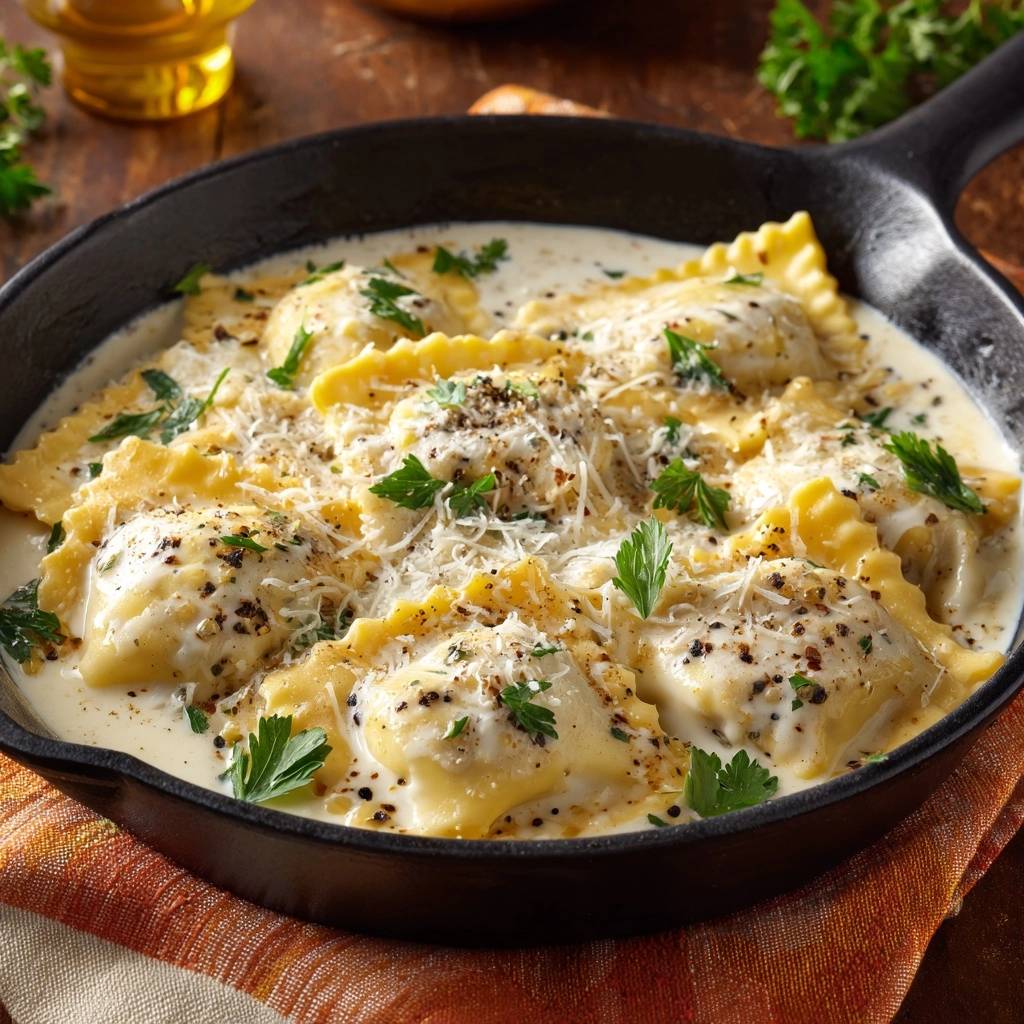 Cremige Pfannen-Ravioli in Parmesan-Sauce