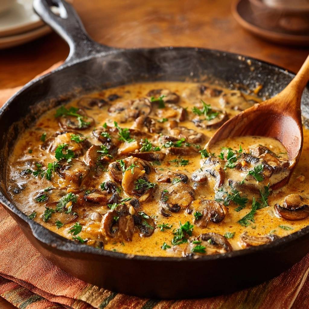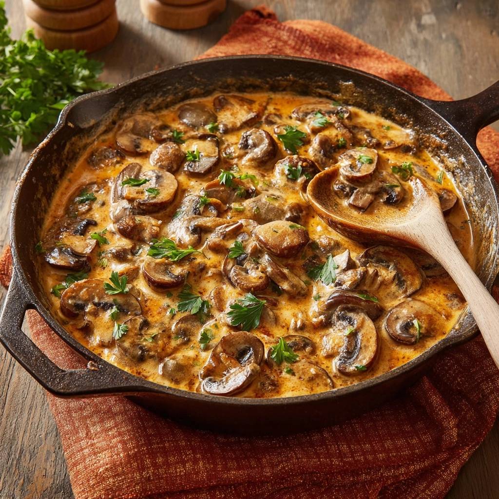 Stell dir vor, du hebst die Gabel zum Mund, und der erste Bissen explodiert vor Cremigkeit. Die Pilze sind goldbraun angebraten, umhüllt von einer samtigen Sahnesoße, die sich perfekt an die Zunge schmiegt. Kein Tropfen Wasser, nur purer Pilzgeschmack, der dich sofort süchtig macht.
