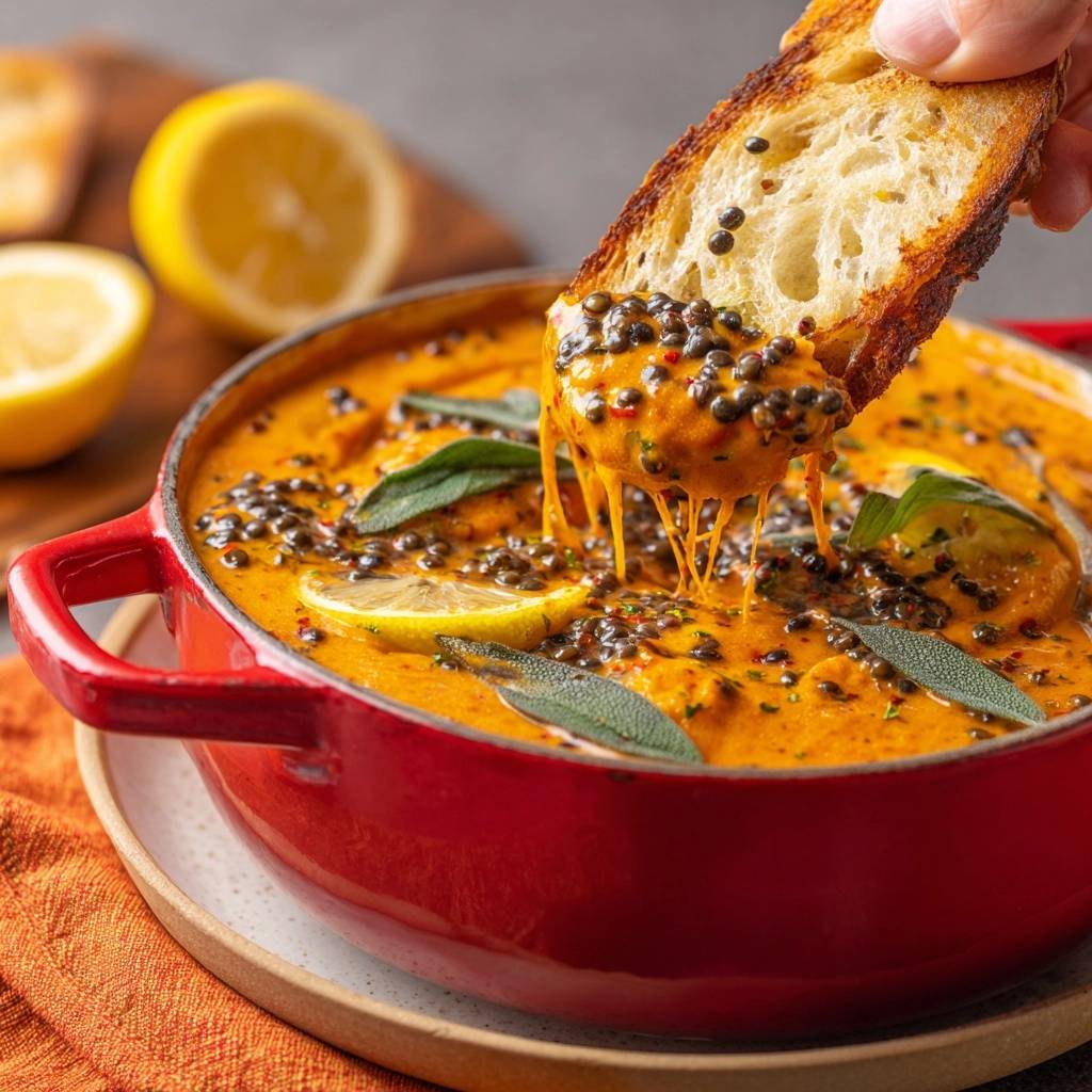 In Schalen füllen, mit restlichen Salbeiblättern toppen. Heiß mit Baguette dippen. Salbei knusprig braten für Extra-Crunch.