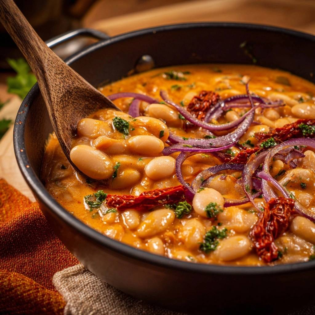 Stell dir vor, du löffelst den ersten Bissen dieses Eintopfs. Die weißen Bohnen knacken bissfest zwischen den Zähnen, während eine cremige Tomatensoße sie umhüllt. Der Duft von gebratenen Zwiebeln mischt sich mit einem leichten Chili-Kick, der alles aufpeppt. Genau so soll’s sein.