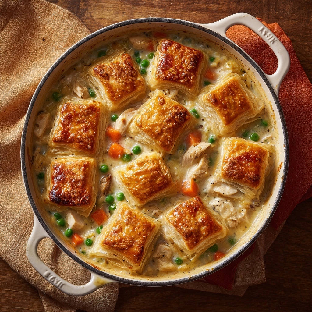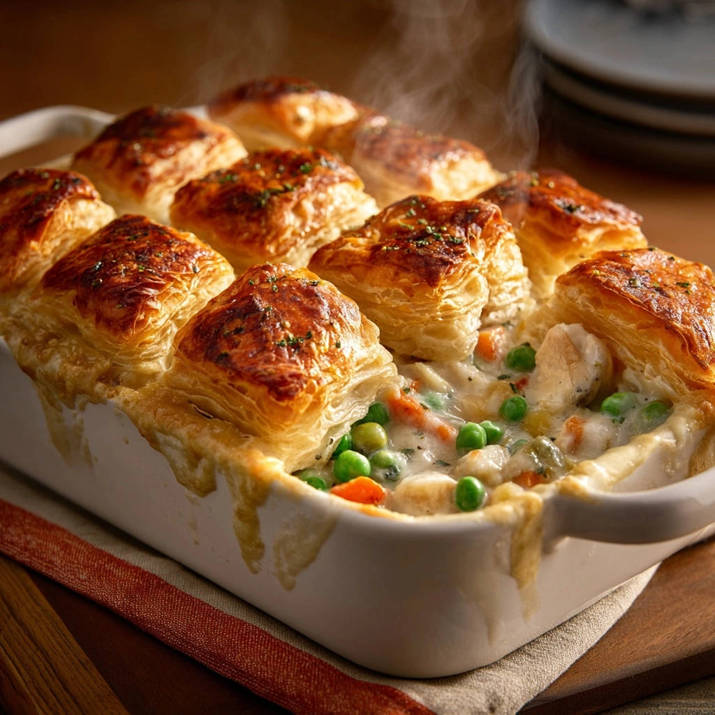Es gibt Rezepte, die einen einfach von der ersten Gabel an in ihren Bann ziehen – und dieser Cremige Hähnchen-Topf-Auflauf mit seinem goldbraunen und herrlich aufgehenden Blätterteig gehört definitiv dazu! Schon beim ersten Anblick des knusprigen Teigs, der sich wie eine Wolke über die cremige Füllung wölbt, spürt man sofort: Hier erwartet einen etwas ganz Besonderes.