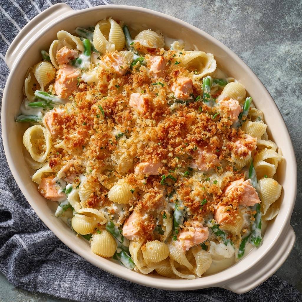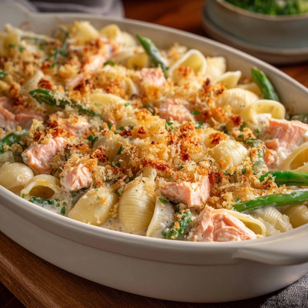 Cremiger Lachs-Conchiglie-Auflauf mit grünen Bohnen (Endlich knuspriges Topping!)