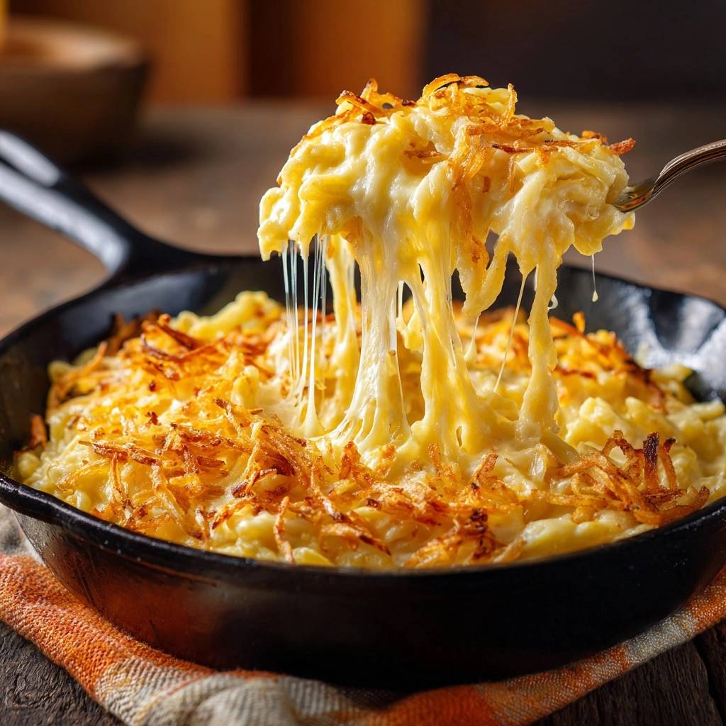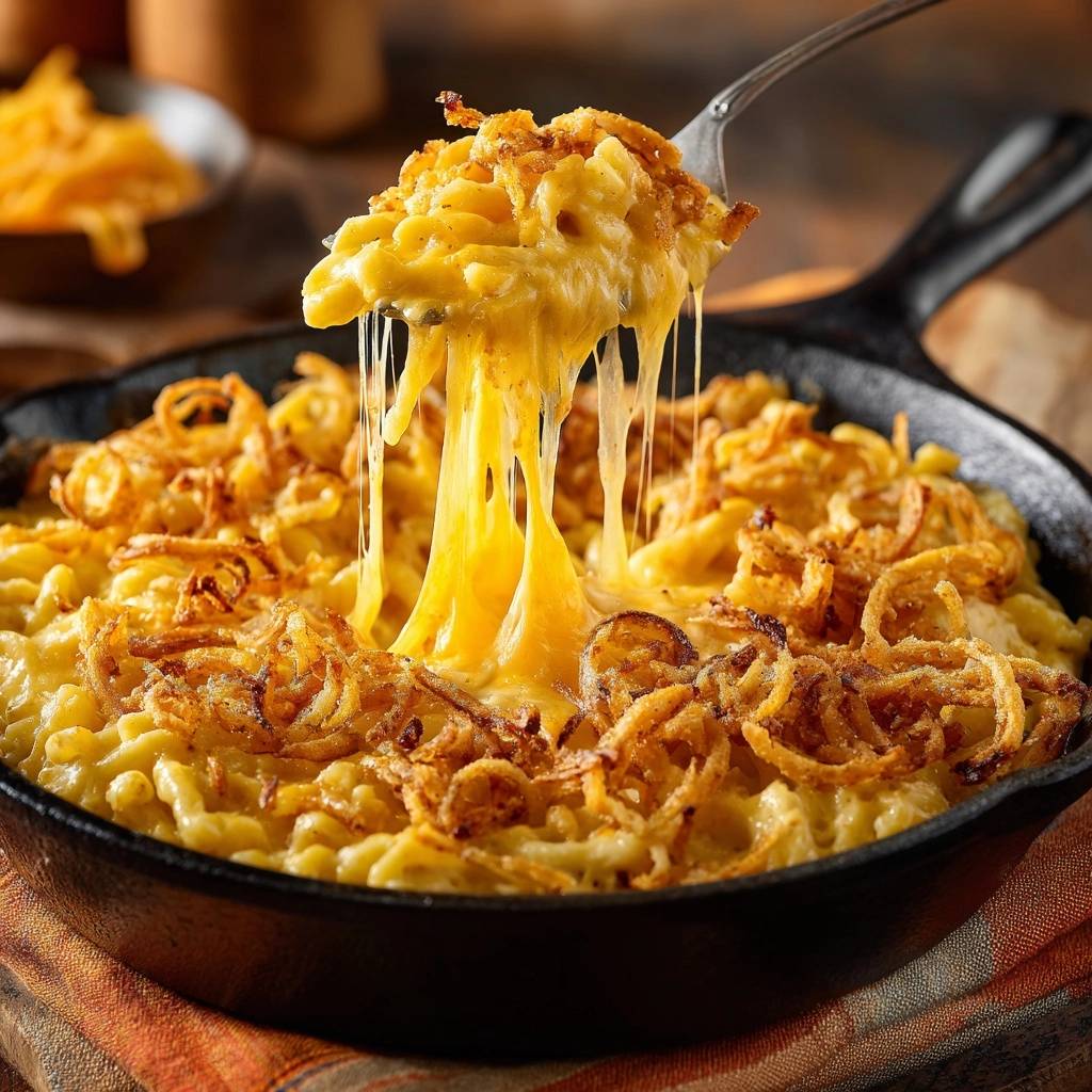 Stell dir vor, du hebst den Löffel zur Pfanne und der Käse zieht sich in dicken Fäden. Der Duft von geschmolzenem Cheddar mischt sich mit der knusprigen Note der Zwiebelstreifen. Dieser cremige Mac and Cheese mit knusprigen Zwiebelstreifen ist pure Wärme auf dem Teller.