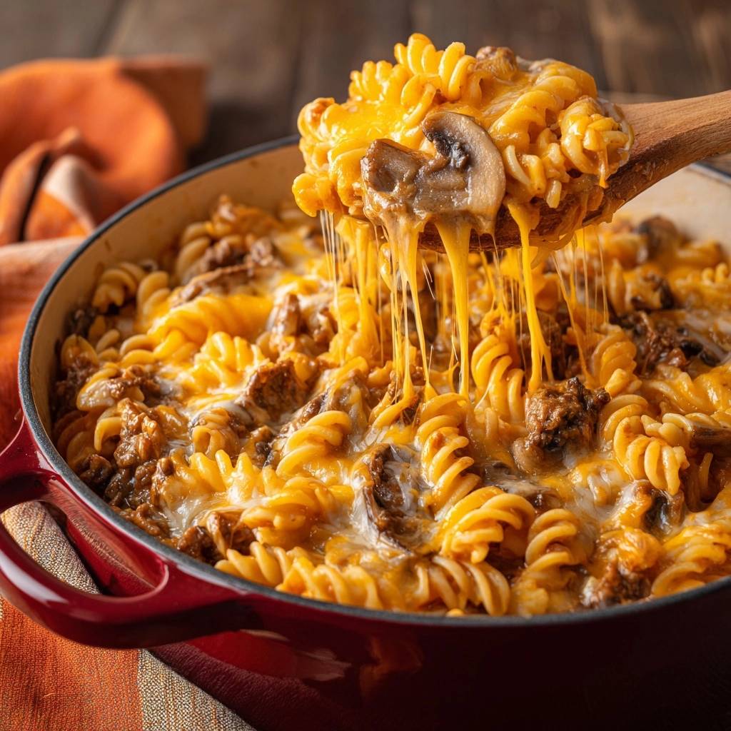 Stell dir vor, du tauchst deine Gabel in eine Pfanne voller goldgelber Nudeln, die von einer dichten, samtigen Soße umschlossen sind. Beim Hochziehen ziehen sich lange, glänzende Käsefäden, während der Duft von scharf angebratenem Rindfleisch und erdigen Pilzen in die Nase steigt.