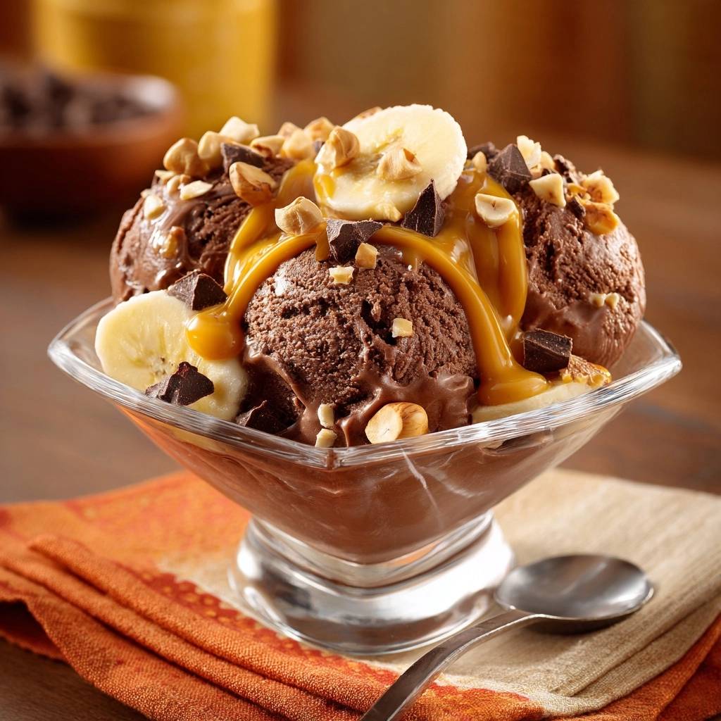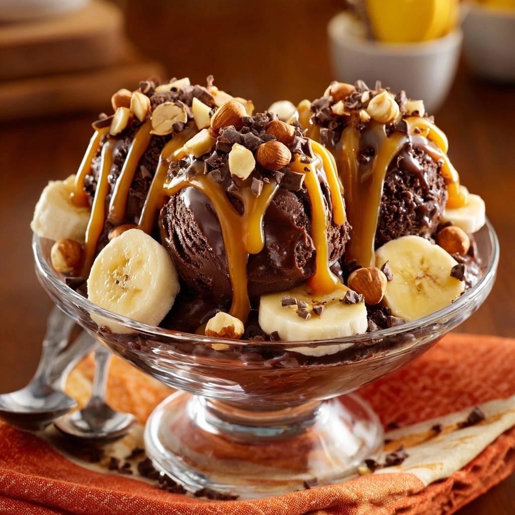 - Anrichten wie auf dem Bild: Geben Sie drei große Kugeln des Schokoladeneises in eine Glasschale. Platzieren Sie die Bananenscheiben und einige ganze Haselnüsse dekorativ um die Kugeln.