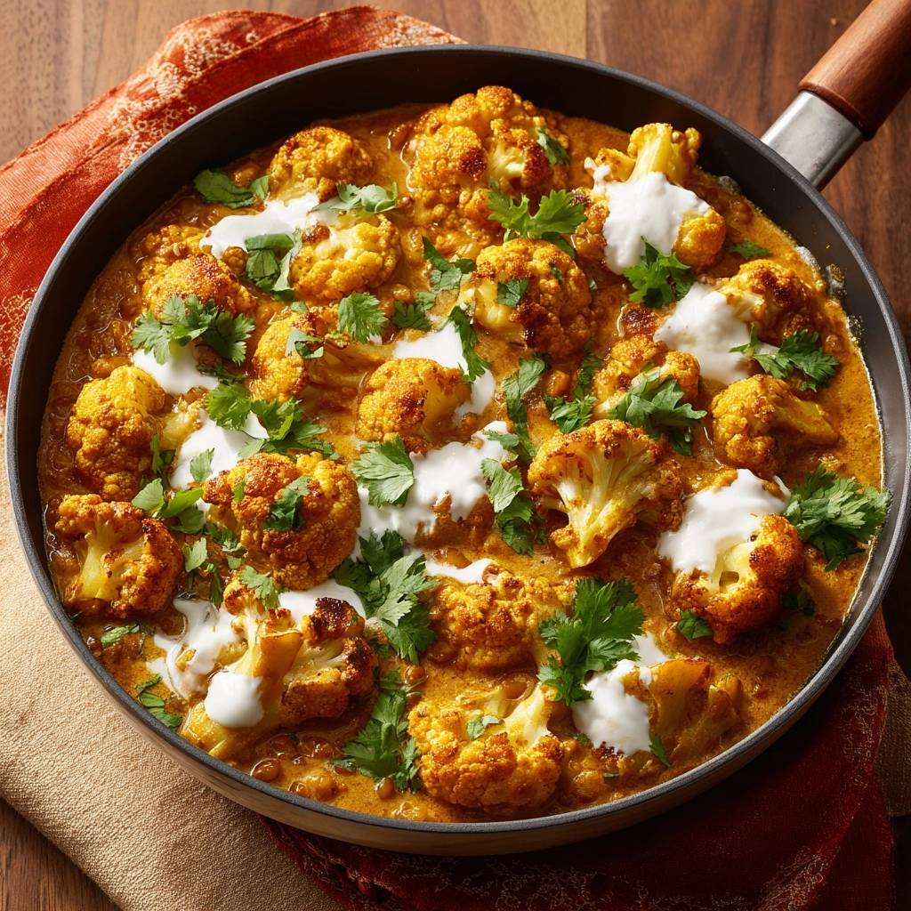 Indisch inspiriert, aber super einfach. Der Anti-Matsch-Trick hält den Blumenkohl knusprig. Vegan anpassbar, indem du Joghurt weglässt.