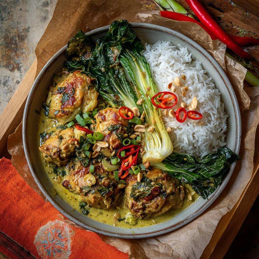 Stell dir vor, du tauchst deinen Löffel in eine Soße, die so samtig und reichhaltig ist, dass sie förmlich am Reis klebt. Der Duft von frischem Zitronengras, Galgant und scharfen grünen Chilis steigt dir in die Nase, während das Hähnchen so zart ist, dass es fast von allein zerfällt.
