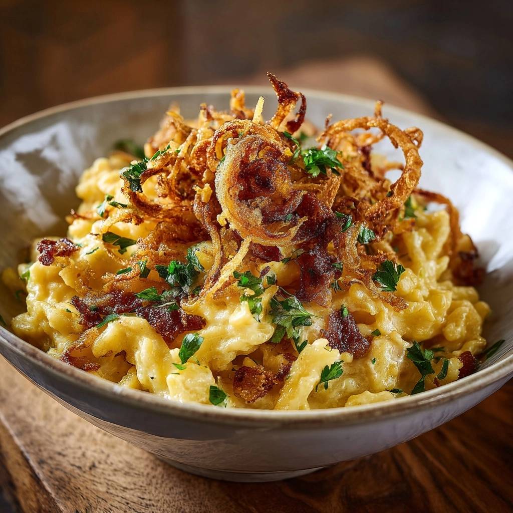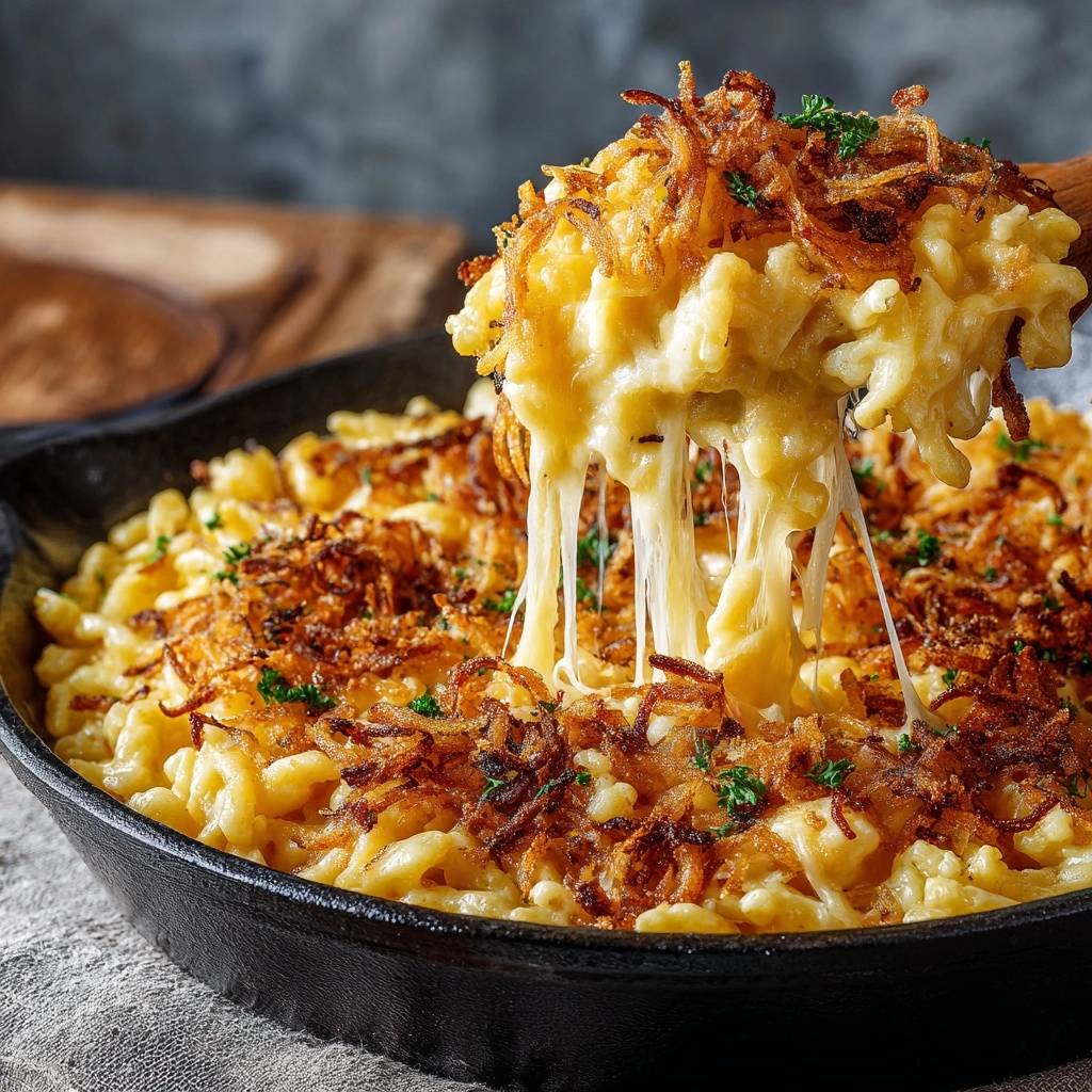 Stell dir vor, du beißt in cremiges Käsemakkaroni, der Käse zieht sich endlos, und oben knuspern goldene Zwiebeln wie ein perfekter Kontrast. Ich hab das so oft vermasselt, bis ich den Trick fand: Zwiebeln separat rösten, damit sie nie matschig werden. Das macht den Unterschied, du wirst staunen.