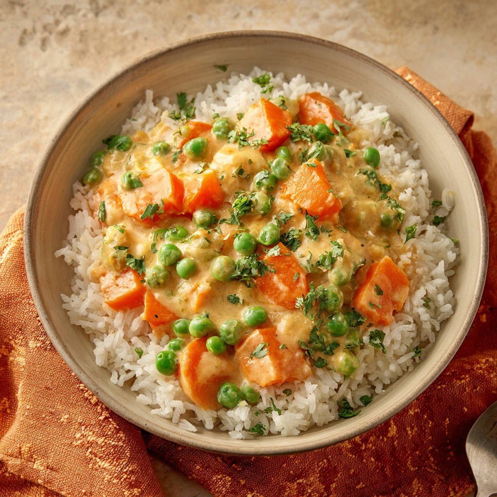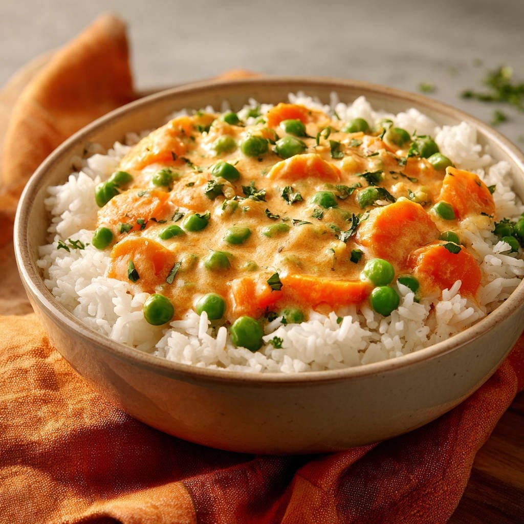 Genießen Sie Ihr Hausgemachtes Cremiges Karotten-Erbsen-Gemüse mit Reis!