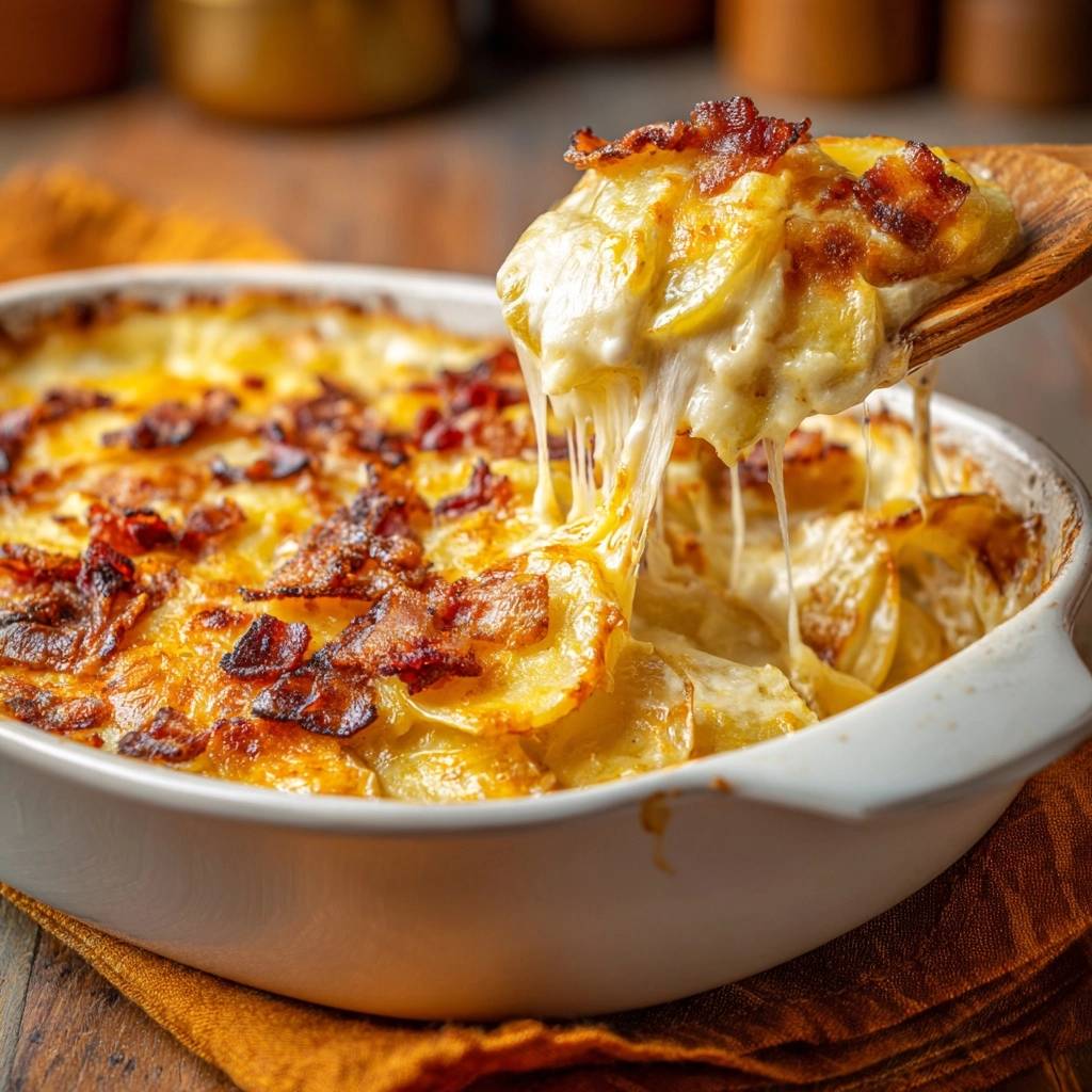 Stell dir vor, du schiebst die Gabel in die goldbraune Kruste. Darunter wartet pure Cremigkeit: zartere Kartoffeln, die in einer reichen Käsesauce baden, durchzogen von knusprigem Speck. Der Biss explodiert im Mund, saftig und fluffig, ohne eine Spur Flüssigkeit.