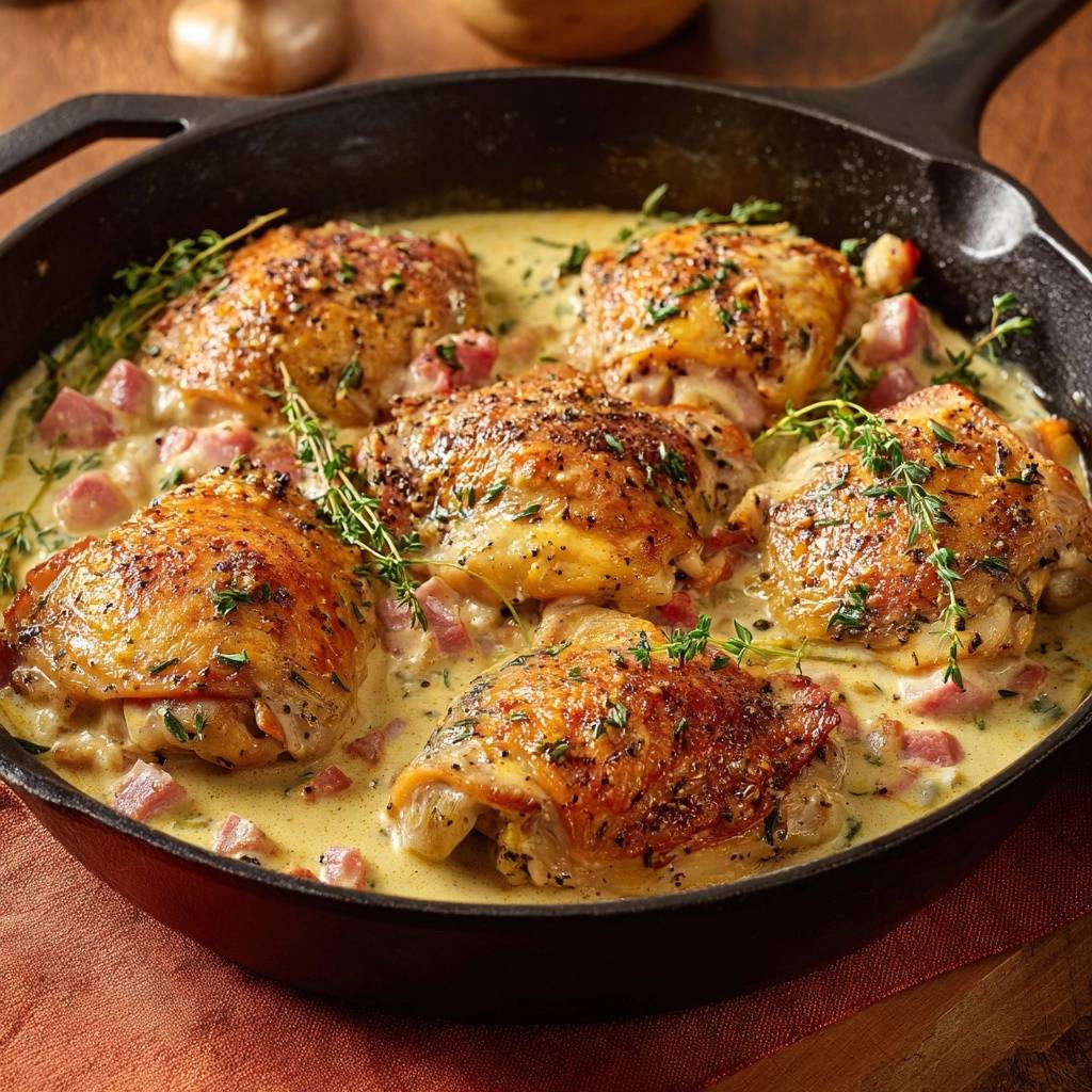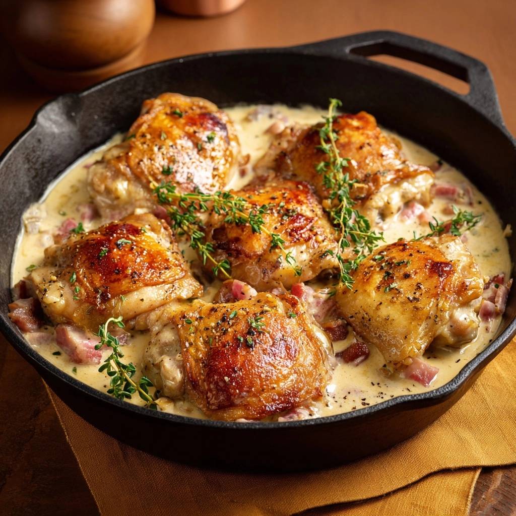 Dieses cremige Pfannenhähnchen mit Speck ist echtes Soulfood für die Feierabendküche. Es ist ehrlich, rustikal und bringt genau die richtige Balance aus herzhaftem Speck und frischem Thymian auf den Tisch.