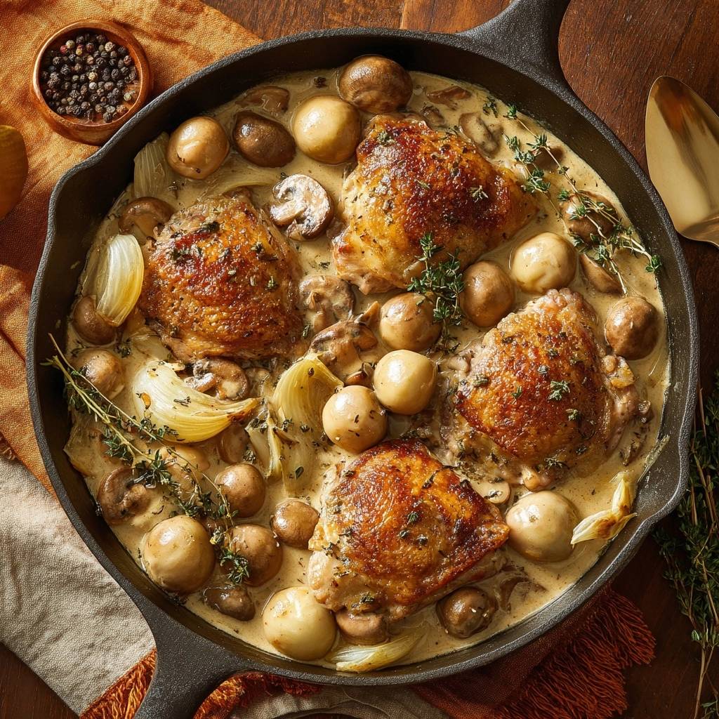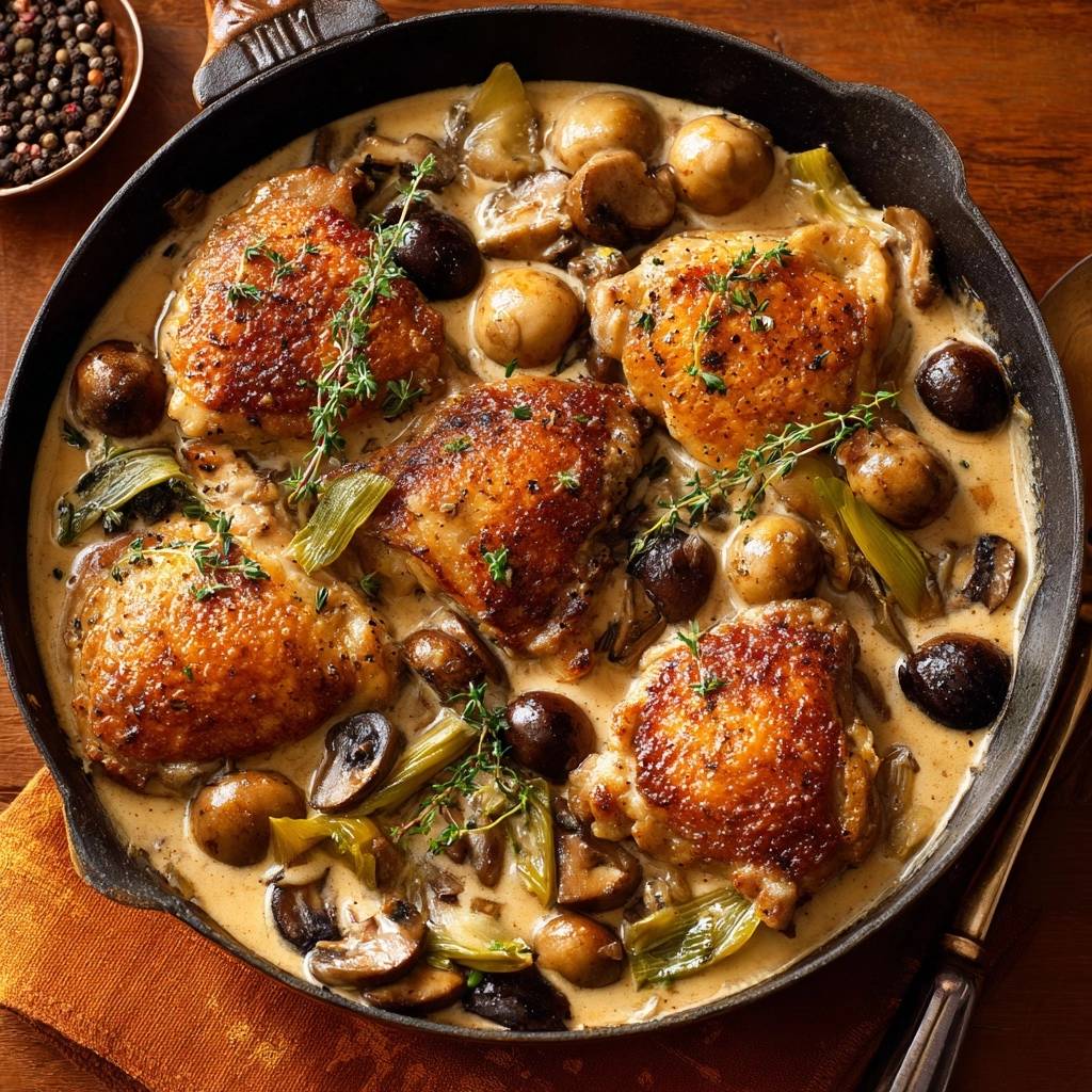 Stell dir vor, du schneidest durch eine goldbraune, krachend krosse Hähnchenhaut direkt in butterweiches Fleisch, das in einer samtigen Pilz-Rahm-Sauce badet. Dieser Duft von frischem Thymian und gebratenen Champignons, der durch die Küche zieht, ist einfach unbeschreiblich.