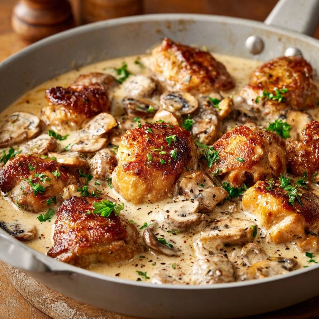 Stell dir vor, du schneidest durch eine goldbraune, krachend knusprige Hähnchenhaut direkt in saftiges Fleisch, das in einer dunklen, samtigen Rahmsoße badet. Der Duft von gebratenem Thymian und erdigen Pilzen zieht durch die Küche und du weißt sofort: Das hier ist kein gewöhnliches Pfannengericht.