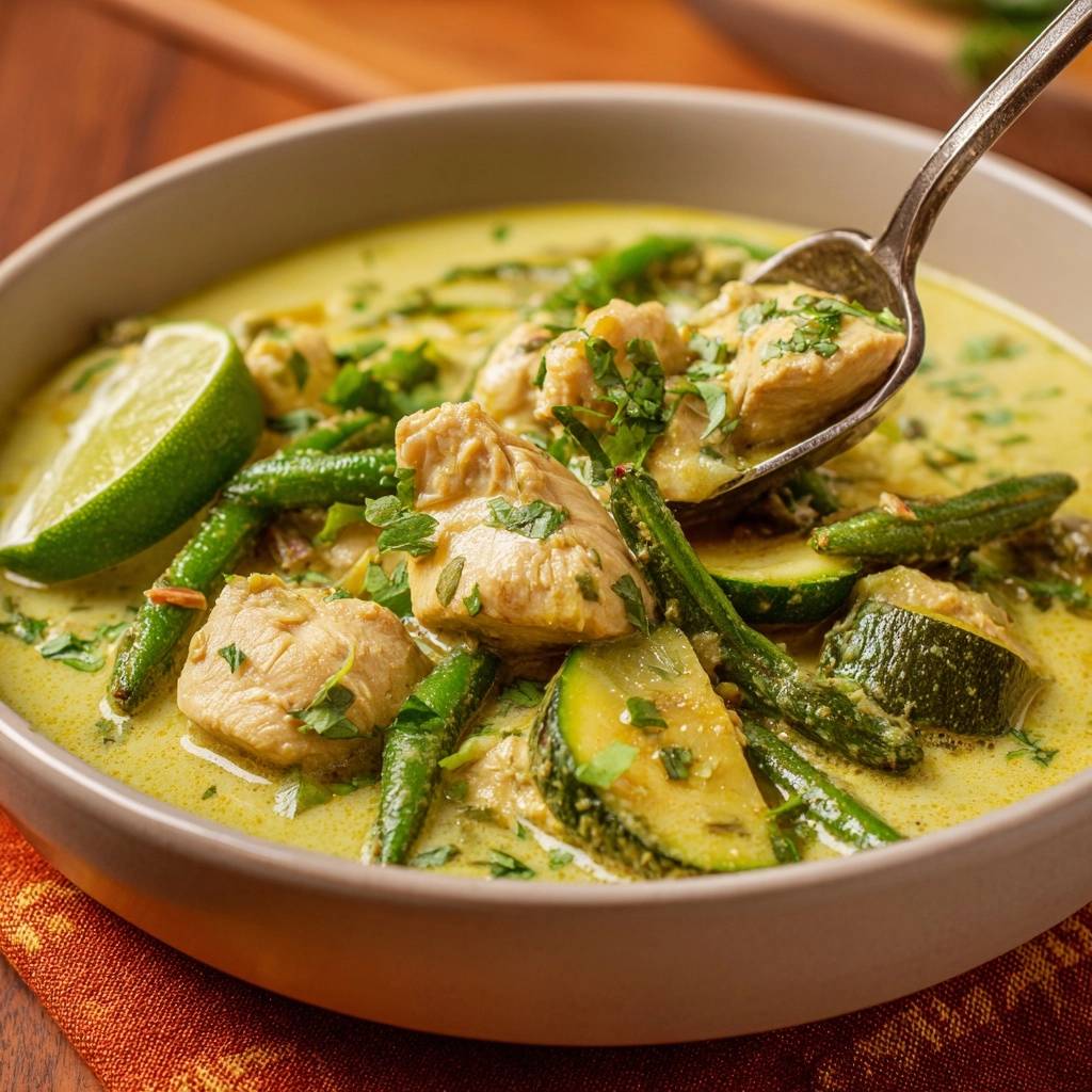 Stell dir vor, du beißt in ein Stück zartes Hähnchen, umhüllt von dieser samtig cremigen Soße, die vor Limette und Curry duftet. Der erste Löffel explodiert im Mund: knackige Bohnen knacken, Zucchini geben Biss, und die Kokosmilch schmiegt sich perfekt an alles an.