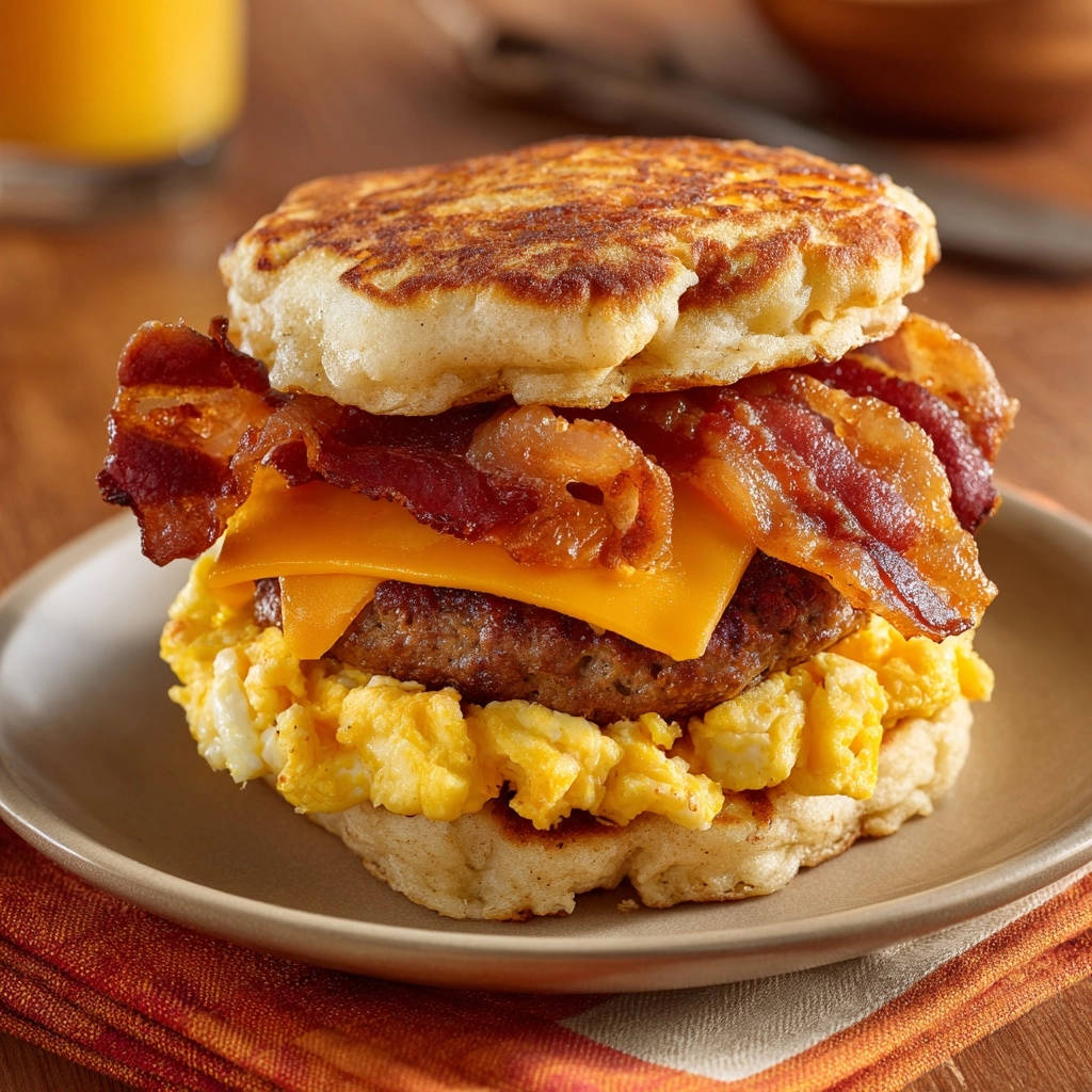 Serviere deinen ultimativen XXL-Frühstücks-Stapel sofort. Guten Appetit und genieße jede perfekt texturierte Schicht dieses außergewöhnlichen Frühstücks!