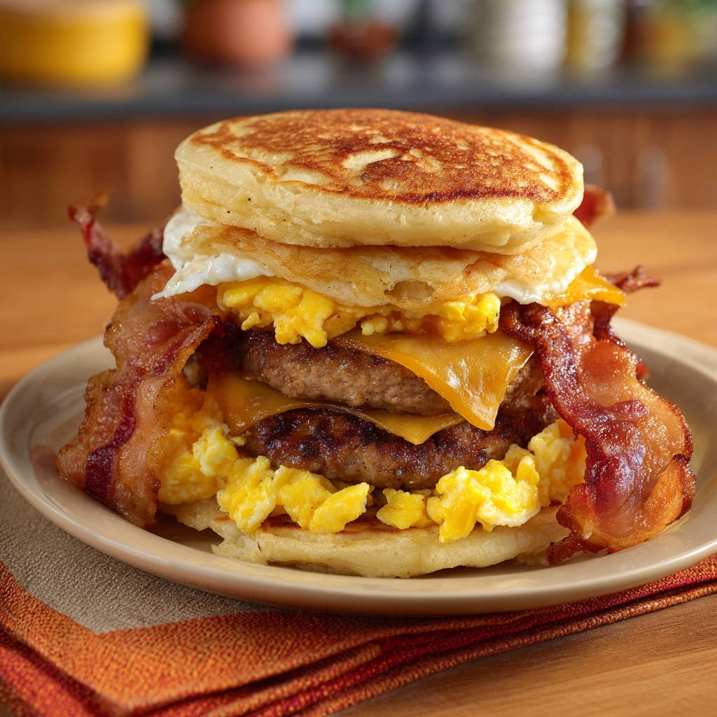 - Serviere deinen ultimativen XXL-Frühstücks-Stapel sofort. Guten Appetit und genieße jede perfekt texturierte Schicht!