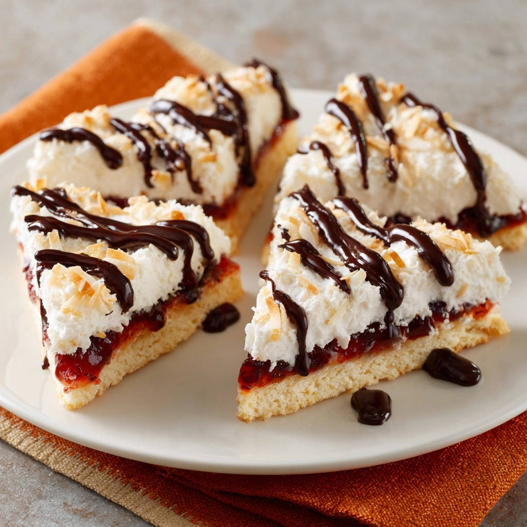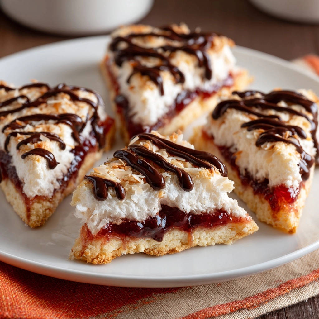 - Dekorieren und Servieren: Nehmt die Schnitten aus dem Ofen und lasst sie vollständig in der Form abkühlen, am besten für mindestens 2 Stunden im Kühlschrank. Das hilft der Struktur und erleichtert das Schneiden. Schmelzt die Zartbitterschokolade über einem Wasserbad oder in der Mikrowelle und träufelt sie über die abgekühlten Schnitten. Bestreut sie optional mit weiteren gerösteten Kokosraspeln. Schneidet sie mit einem scharfen, warmen Messer in dreieckige oder rechteckige Stücke.