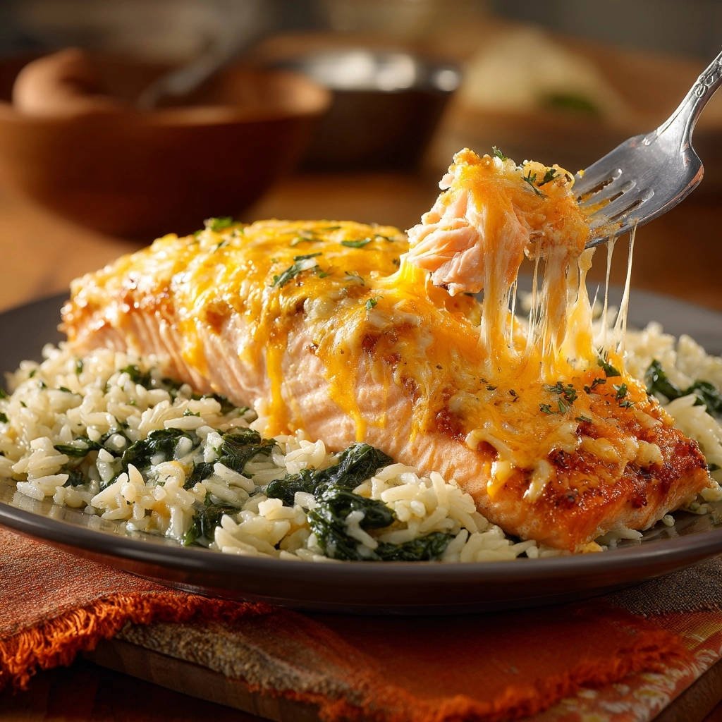 Serviere das Gebackene Lachsfilet mit Käsekruste sofort auf dem vorbereiteten Reis-Spinat-Bett und genieße den unwiderstehlichen Geschmack.