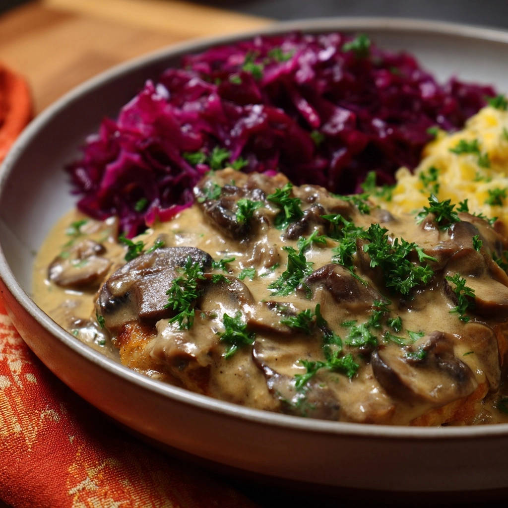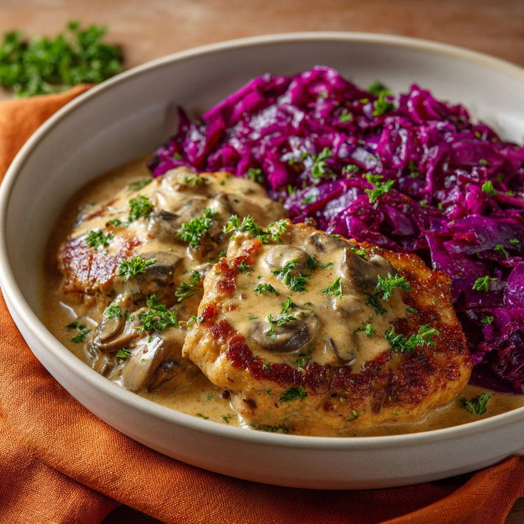 Geflügelschnitzel mit cremiger Champignonrahmsoße und Rotkohl