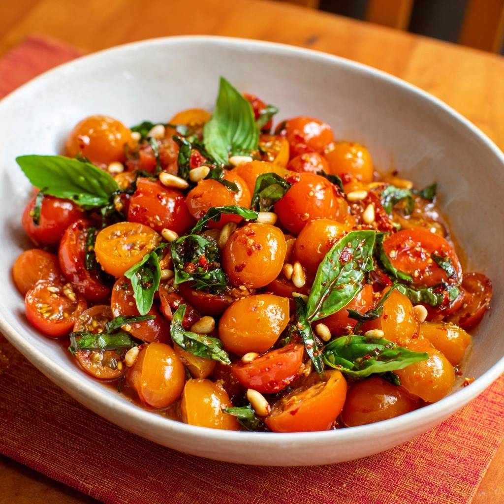 Stell dir vor, du beißt in eine Kirschtomate, die glänzt wie ein Juwel, knackig platzt sie auf der Zunge und explodiert vor süßer Säure. Der Duft von frischem Basilikum mischt sich mit gerösteten Pinienkernen, und alles schmeckt so intensiv sommerlich. Genau das passiert bei diesen glasierten Kirschtomaten mit Basilikum und Pinienkernen.
