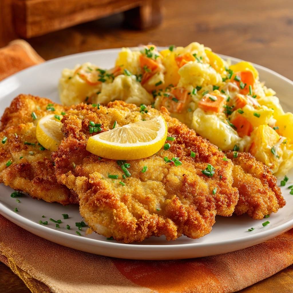 Goldbraunes Wiener Schnitzel mit cremigem Kartoffel-Karotten-Salat