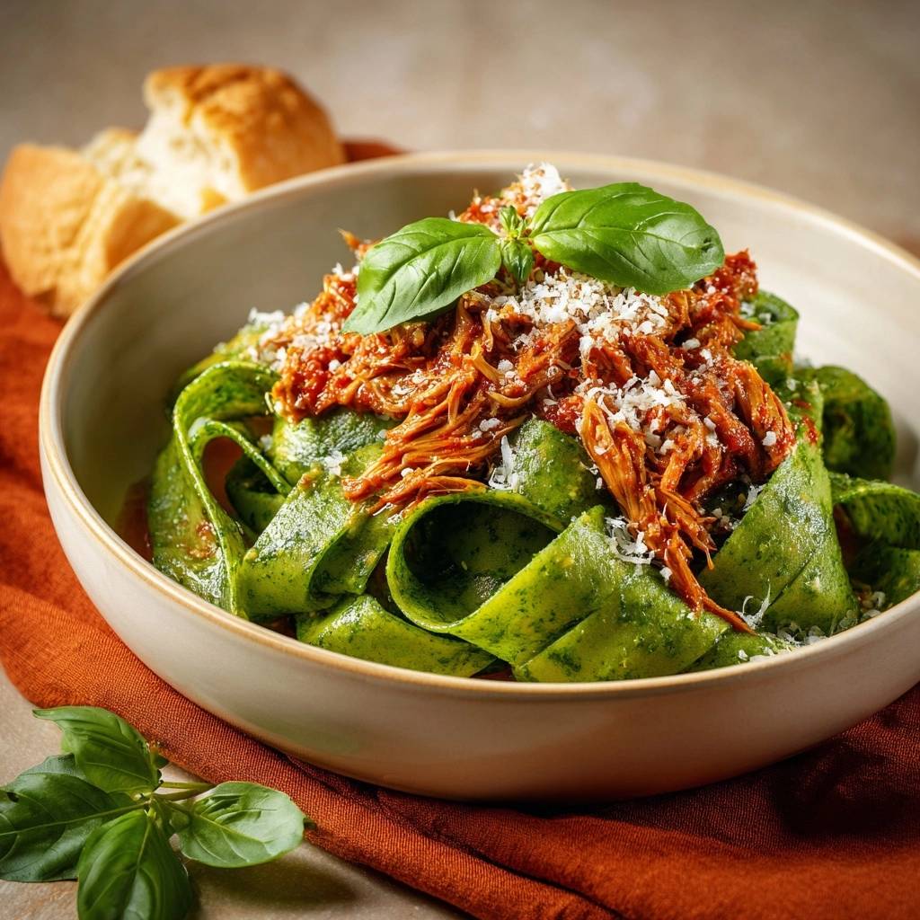 - Anrichten: Die glänzenden Spinat-Pappardelle nestartig in tiefe Teller geben. Das dicke, konzentrierte Pulled-Chicken-Ragout mittig darauf platzieren (nicht unterrühren, um den visuellen Kontrast zwischen Grün und Rot zu bewahren).