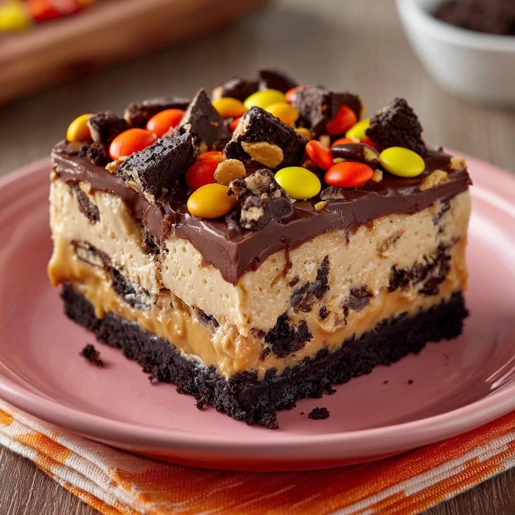 - Schokoladensauce darüber träufeln, mit Reese’s Pieces und zerbrochenen Oreos bestreuen. Abschließend 1-2 Stunden (oder über Nacht) kühlen. Das Highlight: Jede Schicht einzeln 1 Stunde kühlen, bevor die Nächste kommt – so bleiben alle Schichten separat, knusprig und fest, ohne Backen! Vor dem Servieren in Quadrate schneiden. Guten Appetit!
