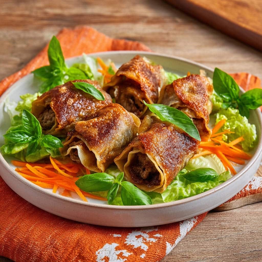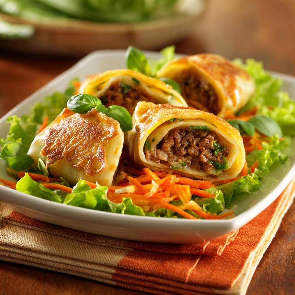 - Servieren: Die knusprigen Hackfleisch-Röllchen auf einem Bett aus frischem Blattsalat und geraspelten Karotten anrichten. Mit frischen Basilikumblättern garnieren und sofort servieren. Guten Appetit!