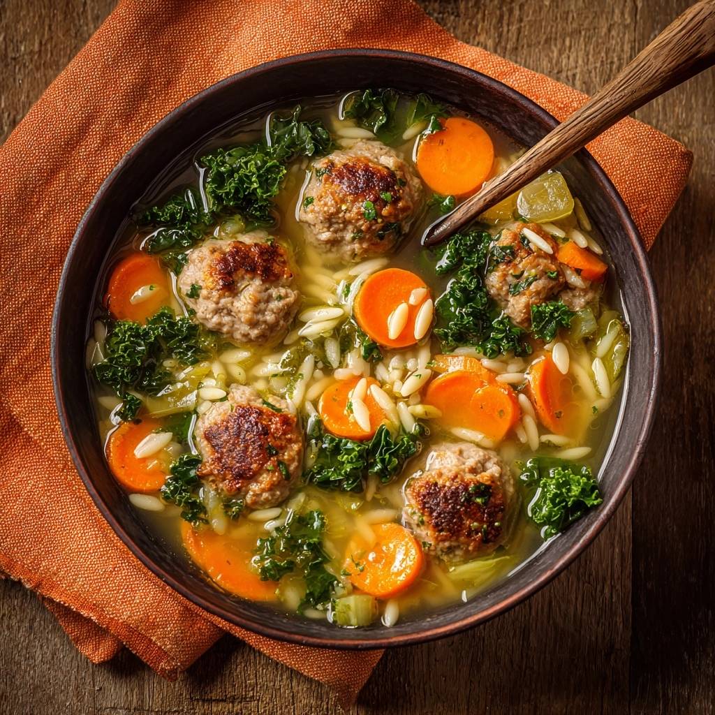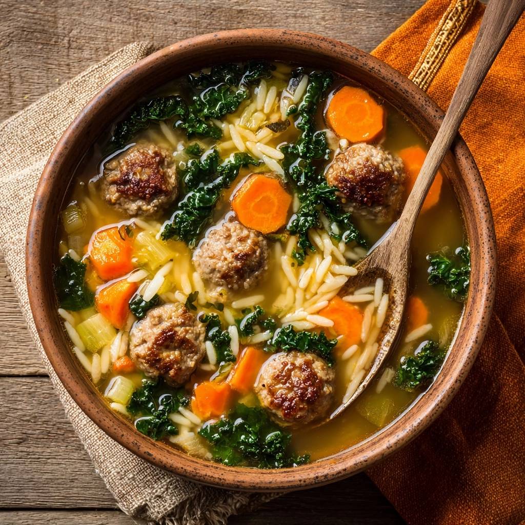 Stell dir vor, du löffelst eine dampfende Brühe, die so tief und würzig schmeckt, dass jeder Schluck dich von innen wärmt. Dazu kommen winzige Pasta-Reiskörner, die genau den richtigen Biss haben, und Fleischbällchen, die außen kross und innen saftig sind.
