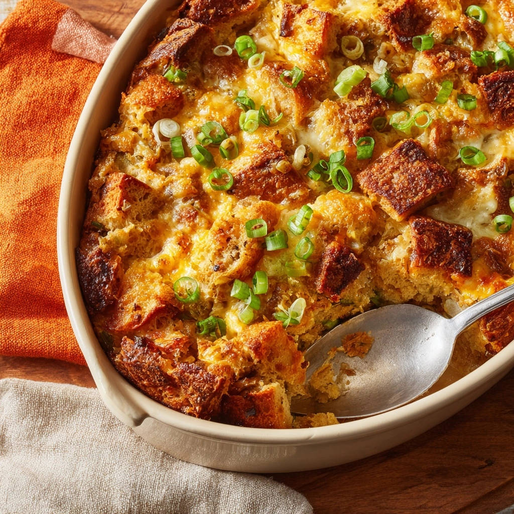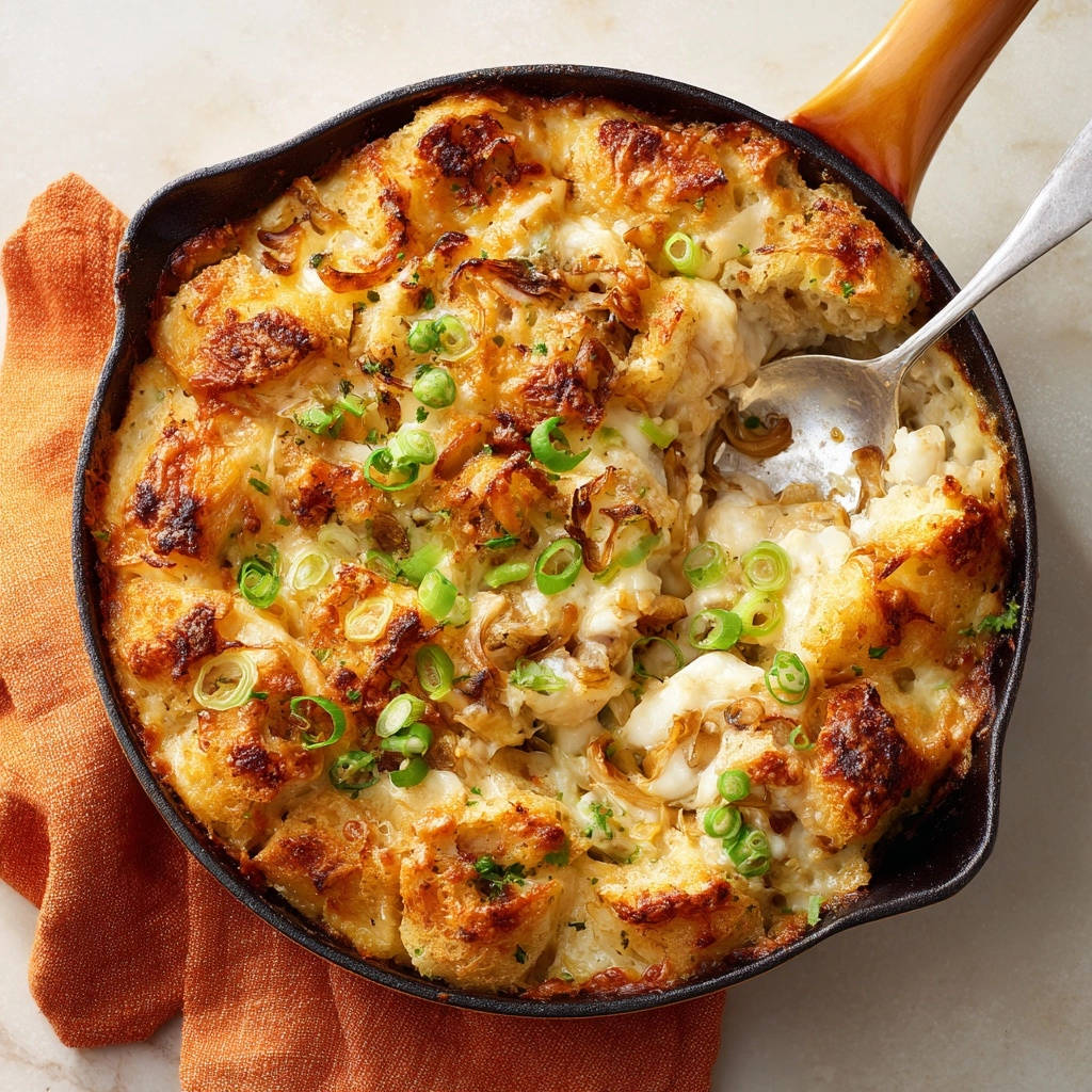 Herzhafter Käse-Zwiebel-Brotpudding: Cremig & knusprig genießen