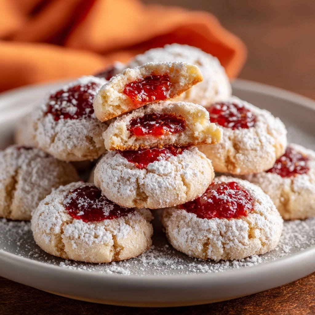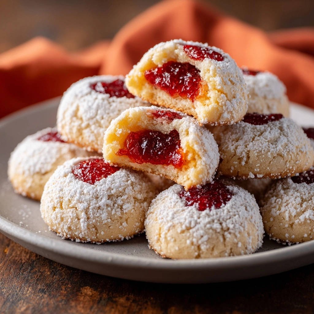 - Bestäuben Sie die abgekühlten Plätzchen großzügig mit Puderzucker. Genießen Sie die zarte Textur und den fruchtigen Kern, der einfach glücklich macht!