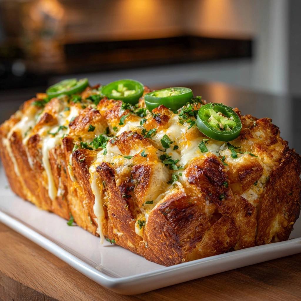 Der Duft von schmelzendem Käse mischt sich mit frischen Jalapeños. Jeder Riss im Brot fängt die Würze ein. Du ziehst Stücke raus, teilst mit Freunden. Es schmeckt scharf, cremig, herzhaft. Perfekt für Partys oder gemütliche Abende.