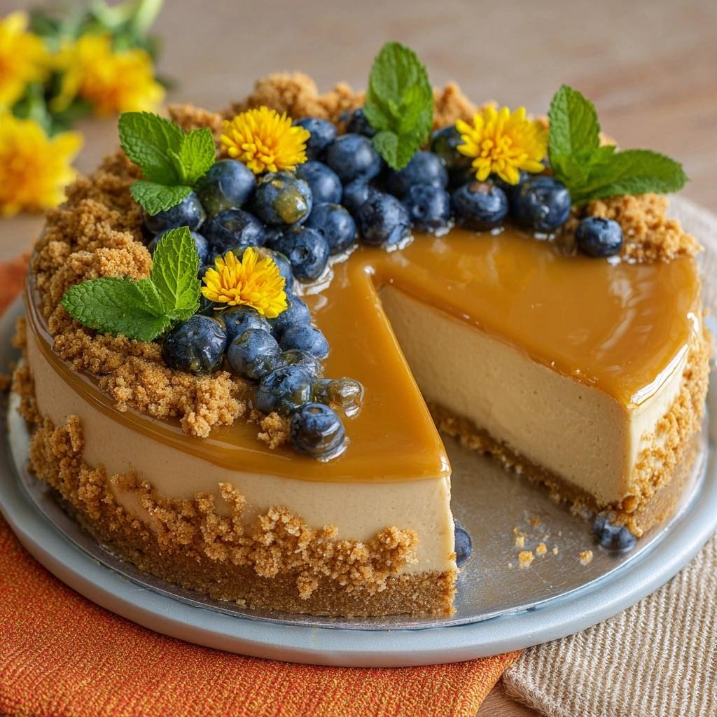 Karamell-Spiegel-Cheesecake mit Heidelbeeren
