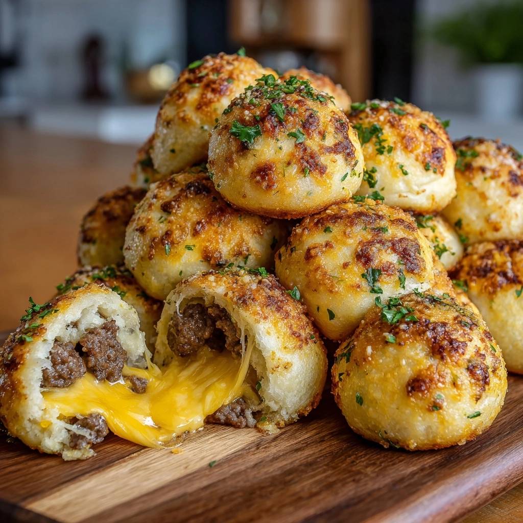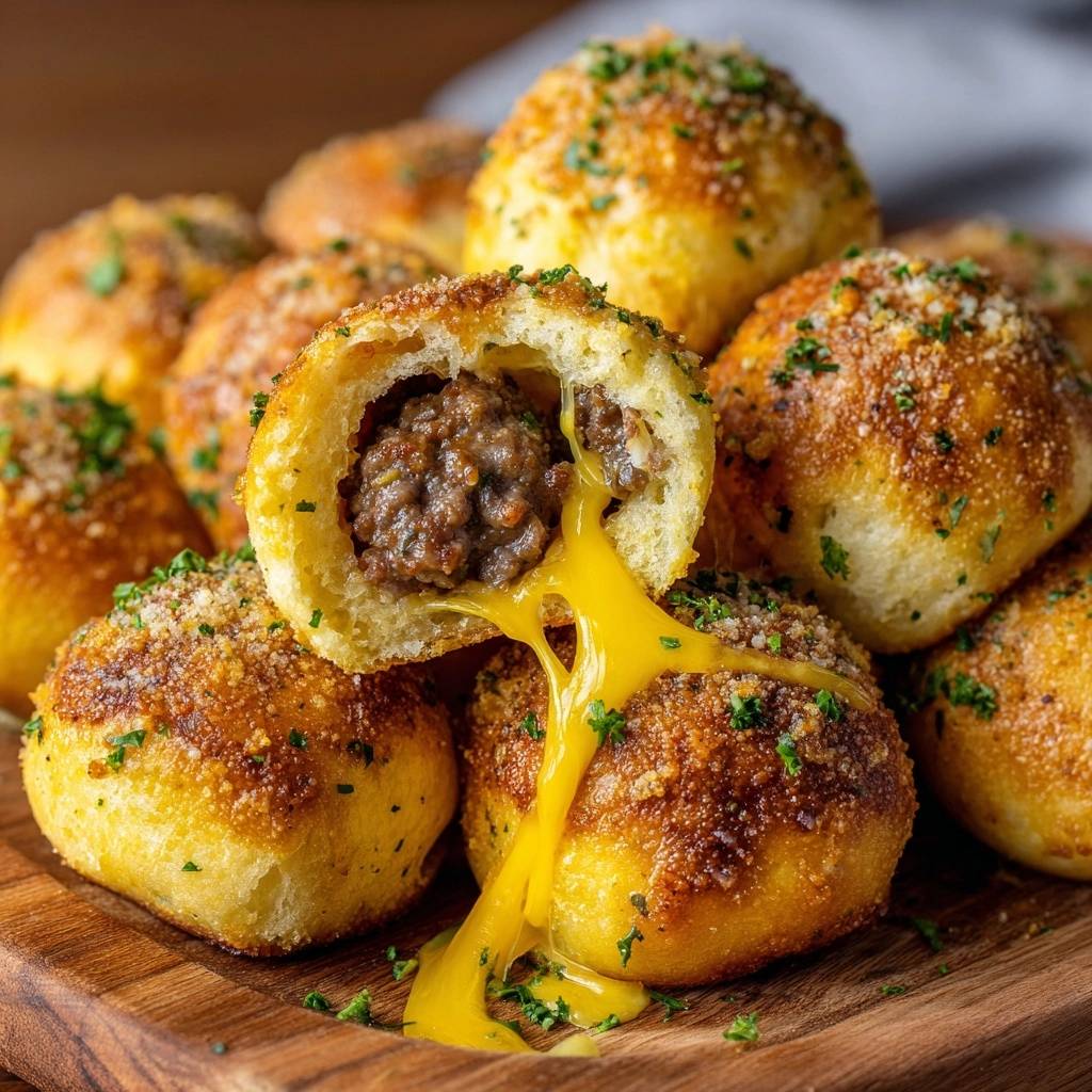 Stell dir vor, du beißt in eine goldene Kugel, und drinnen explodiert saftiges Hackfleisch mit schmelzendem Käse. Der Duft von gebratenem Fleisch und frischer Petersilie zieht durch die Küche, und die Kruste knackt so perfekt, dass du gleich die nächste greifst.