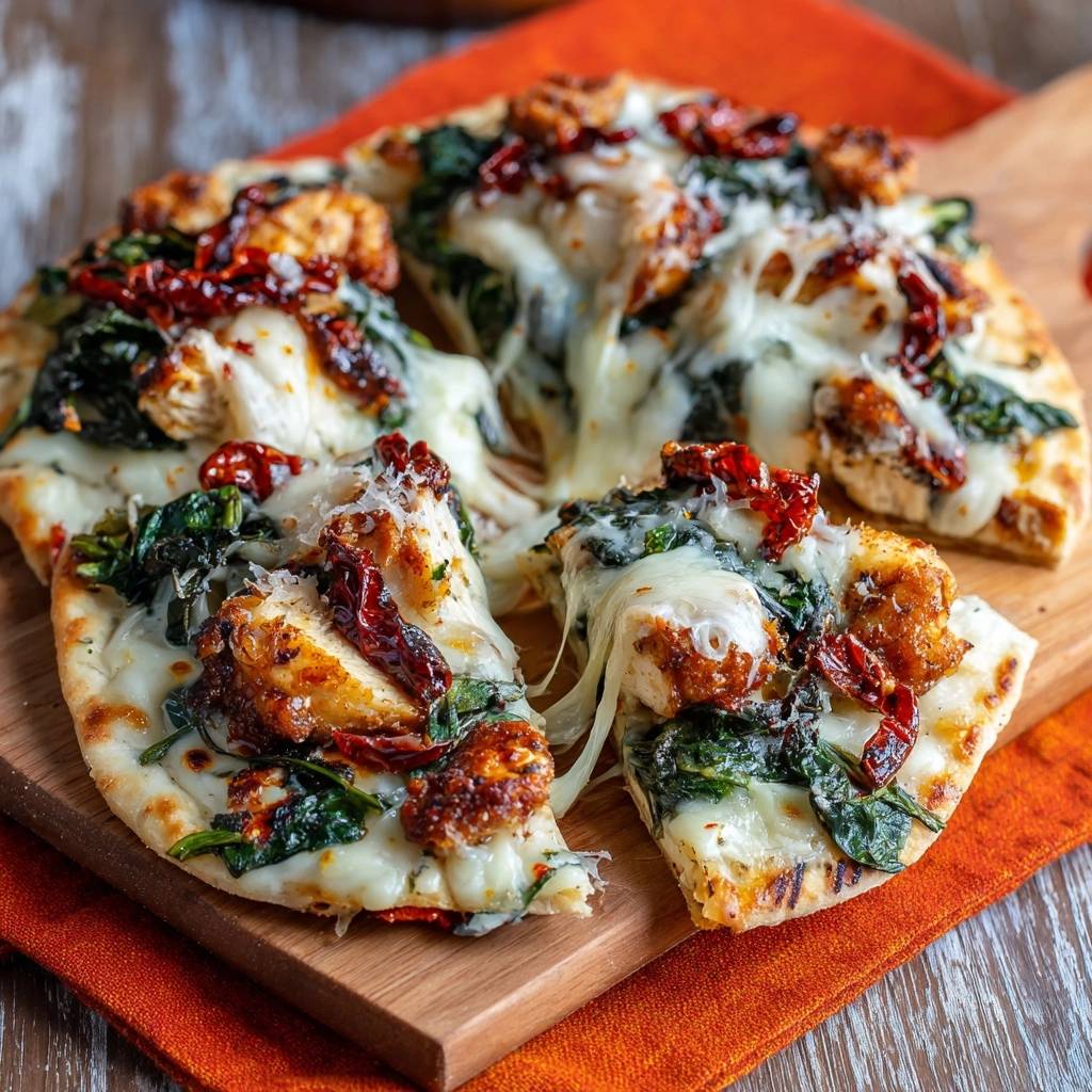 Der erste Bissen knistert so herrlich, und dann explodiert der saftige Hähnchen-Geschmack mit frischem Spinat und dem intensiven Aroma der sonnengetrockneten Tomaten. Du spürst die Knusprigkeit der Panade, während der Käse schön schmilzt und lange Fäden zieht. Diese Flatbread-Pizza ist pure Freude, besonders weil das Hähnchen nie trocken wird.